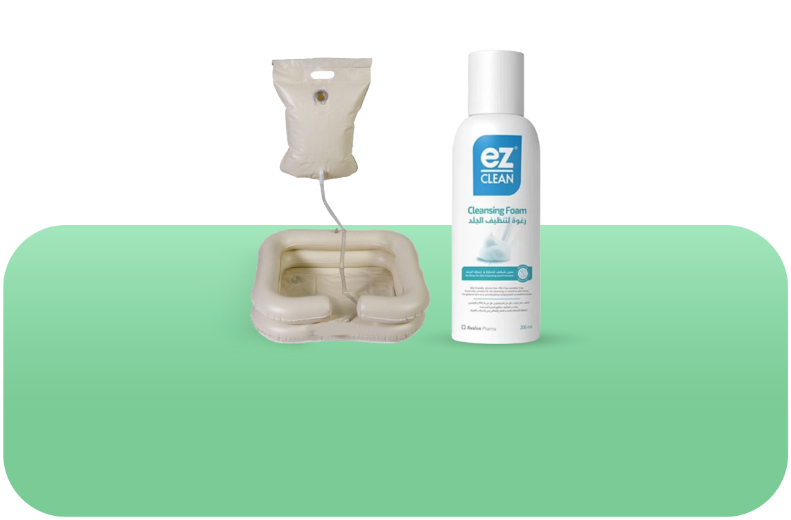 Ex Tax: 90.00 ﷼Inflatble tub for individuals that are bed bound or with limited mobility, and their caregivers.Dimensions: 65*65*20 cm.With water container.Side drai..